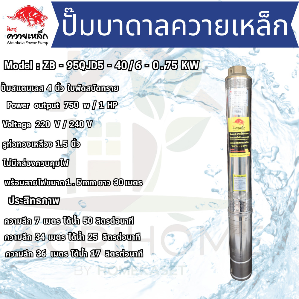 ปั๊มน้ำบาดาลควายเหล็ก ZB-95QJD5-40/6-0.75KW ขนาดกำลังไฟ 0.75 กิโลวัตต์ (1 แรงม้า) เหมาะสำหรับงานสูบน้ำจากบ่อบาดาลตื้นถึงปานกลาง ใช้งานได้ทั้งในครัวเรือนและงานเกษตรกรรม ตัวเครื่องผลิตจากวัสดุแข็งแรง ทนทานต่อการใช้งานต่อเนื่องและการกัดกร่อน มาพร้อมใบพัดสแตนเลสคุณภาพสูง ให้แรงดันน้ำสม่ำเสมอ