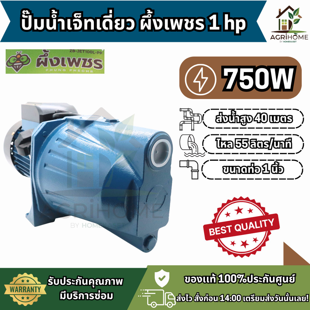 ปั๊มน้ำเจ็ทเดี่ยว ผึ้งเพชร 1 แรงม้า 750W ส่งน้ำสูง 40 เมตร แรงดันดีเยี่ยม เหมาะสำหรับบ้านและฟาร์ม