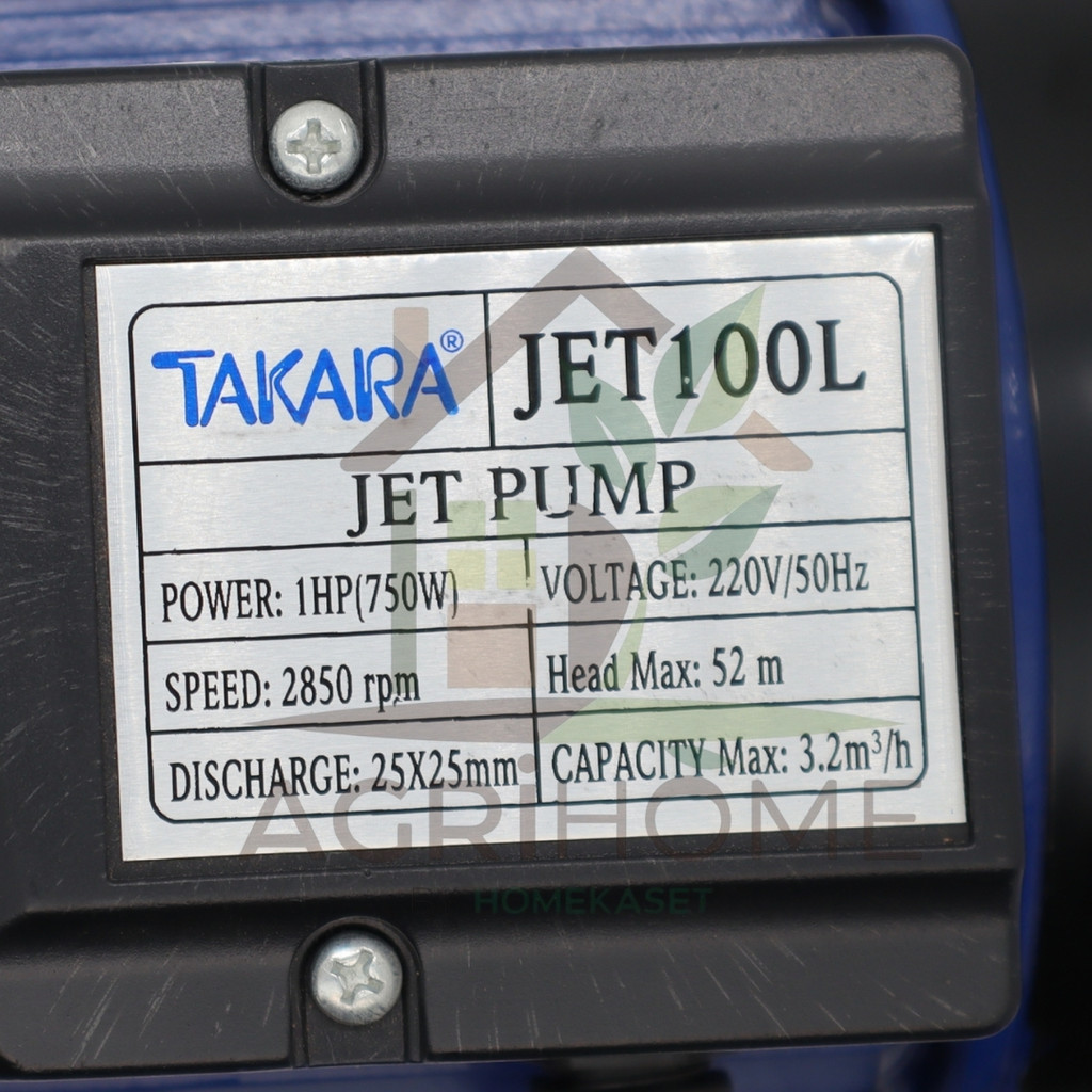ปั๊มน้ำเจ็ทเดี่ยว Takara JET100L ขนาด 1 แรงม้า มอเตอร์กำลังแรง 750 วัตต์ ไฟฟ้า 220V เหมาะสำหรับงานสูบน้ำทั่วไปทั้งในครัวเรือนและการเกษตร โดดเด่นด้วยกำลังส่งสูงถึง 52 เมตร และอัตราการไหลสูงสุด 60 ลิตรต่อนาที มอเตอร์คุณภาพสูง รอบจัด 2850 RPM พร้อมระบบท่อเข้าออกมาตรฐาน 1 นิ้ว แข็งแรง ทนทาน ใช้งานได้ต่อเนื่อง คุ้มค่าทุกการลงทุน เหมาะสำหรับผู้ที่มองหาปั๊มน้ำคุณภาพสูงในราคาประหยัด