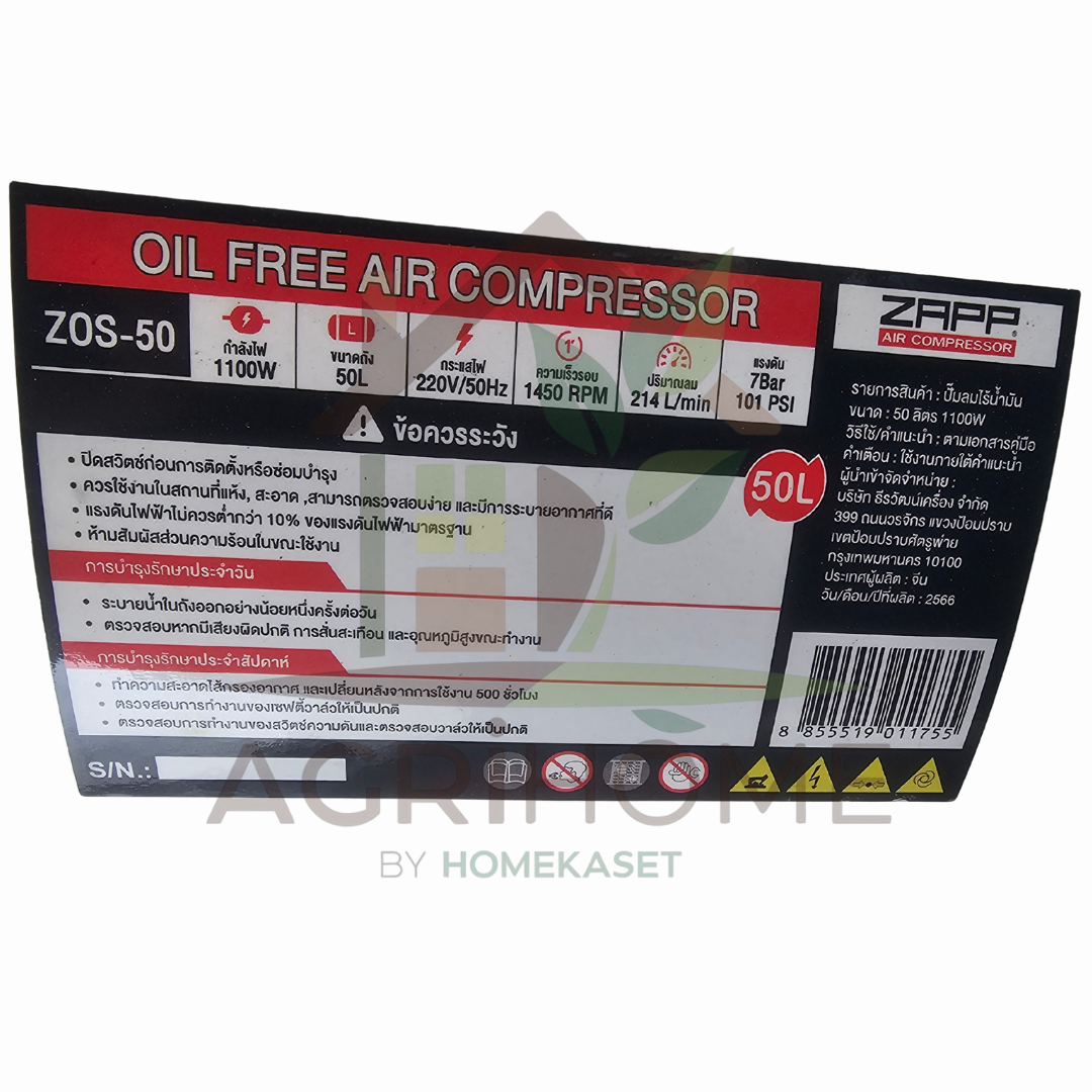 - รุ่น ZAPP ZOS-50 ปั๊มลม Oil Free ขนาดถัง 50 ลิตร