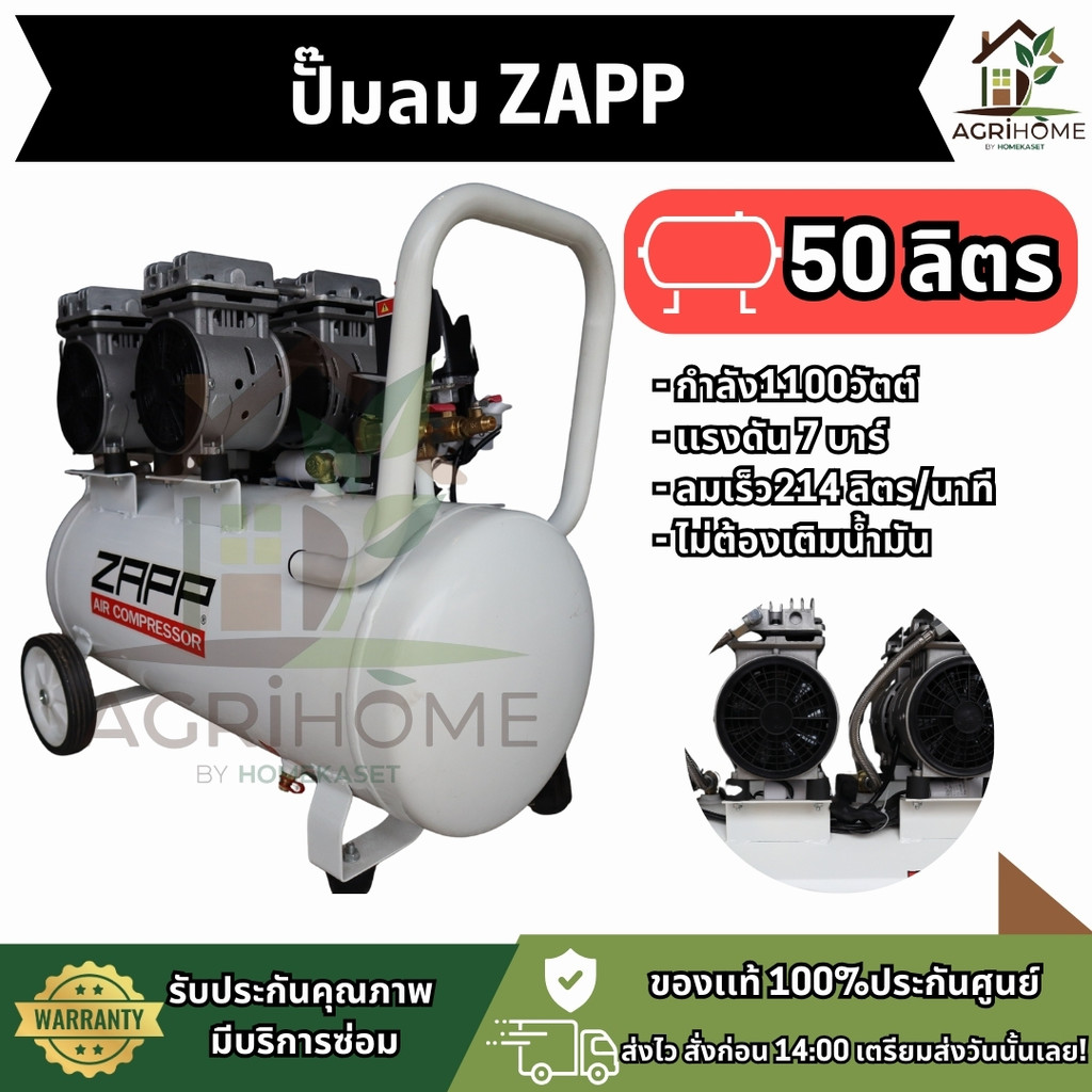 ปั๊มลม Oil Free ZAPP 50ลิตร 1100W แรงดัน7บาร์ ลมเร็ว214ลิตร/นาที เสียงเงียบ ไม่ต้องเติมน้ำมัน