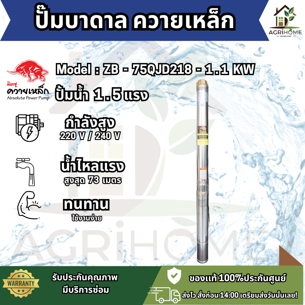 - กำลังไฟ 1.1KW (1.5HP) ใช้ไฟบ้าน 220–240V
