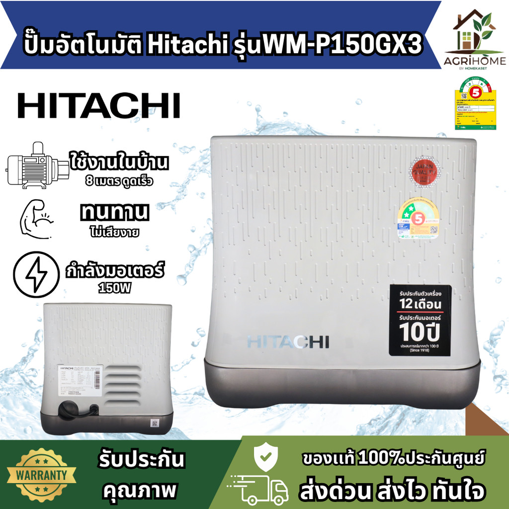 ปั๊มน้ำอัตโนมัติ Hitachi WM-P150GX3 150W เงียบ ทน ไม่สั่น ดูดลึก 8 ม. เหมาะใช้ในบ้าน 1–2 ชั้น ประหยัดไฟ