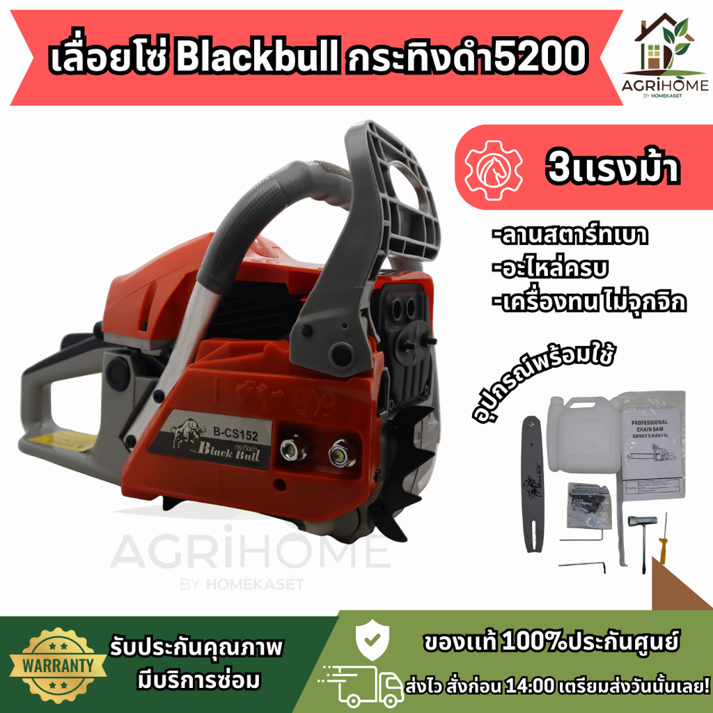 เลื่อยยนต์ Blackbull 5200 B-CS152 กะทิงดำ เลื่อยยนต์สำหรับงานหนักที่ช่างไม้และเกษตรกรเลือกใช้ ด้วยกำลังเครื่องยนต์ 3 แรงม้า ลูกสูบใหญ่ 45 มิล 2 แหวน แข็งแรงทนทาน ใช้งานต่อเนื่องทั้งวันไม่กลัวร้อนน็อค บาร์ 11.5 นิ้ว พร้อมโซ่ฟันเต็มตัดได้เร็วและคม สตาร์ทง่ายด้วยระบบลานดึงเบา คาร์บูไดอะแฟรม เร่งติดมือ ตัดไม้ ตัดยาง และงานสวนได้สบาย ราคาคุ้มค่า มีอะไหล่รองรับ ไม่ต้องกังวลเรื่องการซ่อมบำรุง