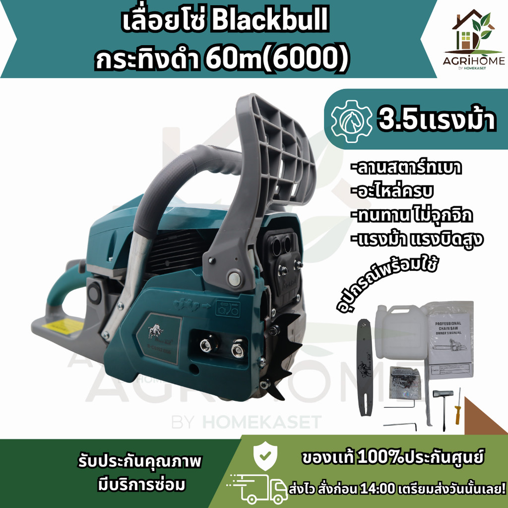 BLACKBULL เลื่อยยนต์ กะทิงดำ รุ่น 6000 60M เลื่อยยนต์พลังแรงสำหรับงานหนัก ตอบโจทย์เกษตรกรและช่างไม้ที่ต้องการเครื่องทนทานใช้งานได้จริง ด้วยลูกสูบใหญ่ 45.2 มิล กำลังเครื่องยนต์ 3.5 แรงม้า มาพร้อมระบบสตาร์ทดึงเบา สตาร์ทง่าย เครื่องร้อนไม่ดับ ใช้งานต่อเนื่องได้ทั้งวัน บาร์ยาว 11.5 นิ้ว พร้อมโซ่ฟันเต็ม ตัดไม้ ตัดยาง หรืองานฟาร์มได้ราบรื่น คุ้มค่า ของแท้ 100% มีอะไหล่รองรับ ซ่อมบำรุงง่าย ใช้งานได้ยาวนาน