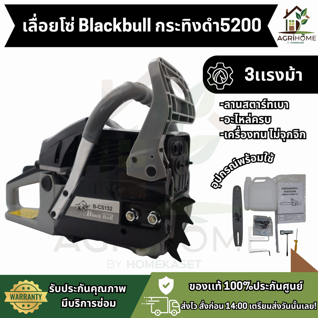 เลื่อยยนต์ Blackbull 5200 กะทิงดำ รุ่น B-CS152 เลื่อยยนต์ที่ออกแบบมาเพื่อการใช้งานหนักจริงจัง เครื่องแรง 3 แรงม้า สตาร์ทง่าย ติดง่ายทั้งตอนเครื่องร้อนและเย็น บาร์ 11.5 นิ้ว พร้อมโซ่ตัดไม้คุณภาพสูง เครื่องไม่ดับแม้ใช้งานต่อเนื่อง อะไหล่หาง่าย ใช้งานได้คุ้มค่า เหมาะสำหรับเกษตรกรและช่างไม้ที่ต้องการเลื่อยยนต์ที่ไว้ใจได้