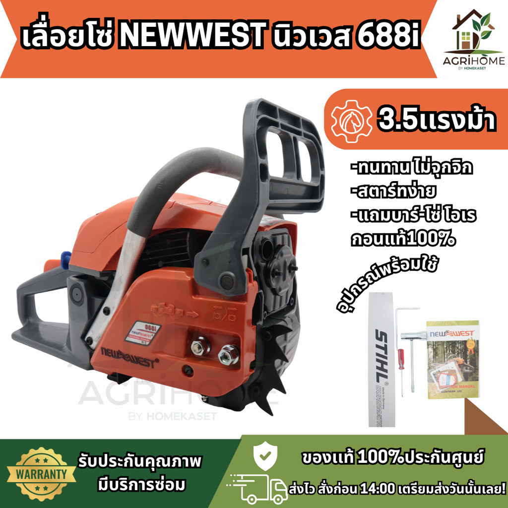 เลื่อยยนต์ NEWWEST 688 พลังแรง 3 แรงม้า ตัดไม้ได้ลื่นไม่สะดุด 11.5 นิ้ว และโซ่ฟันเต็ม ใช้งานได้จริงทั้งในสวนและงานเกษตร เครื่องแรงบิดสูง ทำงานต่อเนื่องไม่ร้อนน็อค แข็งแรงทนทาน อะไหล่หาง่าย คุ้มค่า เหมาะกับเกษตรกรและผู้ใช้งานทั่วไปที่ต้องการเลื่อยยนต์ไว้ใช้งานจริง