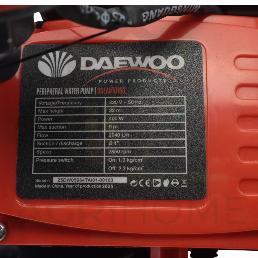 ปั๊มน้ำอัตโนมัติ DAEWOO DAEAUTO160 400W ส่งน้ำสูง 32 เมตร ดูดลึก 9 เมตร แรงดันดี เหมาะใช้ในบ้านและอาคาร